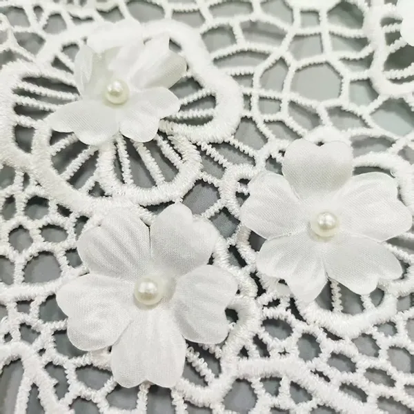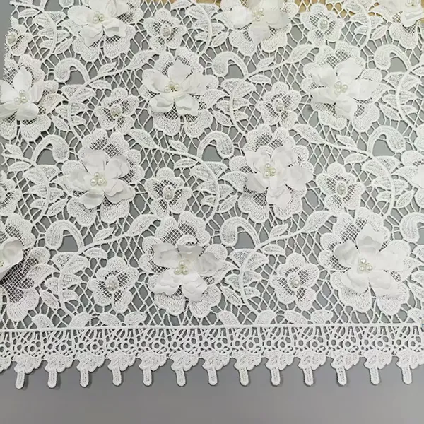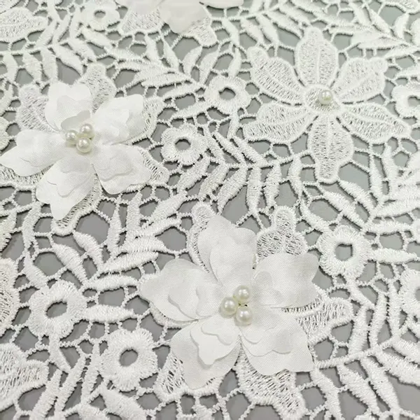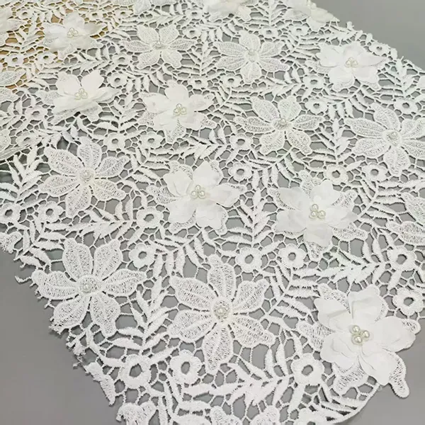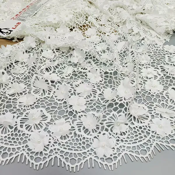 3Dフローラルレースガイピアファブリックパール水溶性コード刺繍ガイピュアレースファブリックこのファブリックは、複雑な刺繍と豪華なディテールを組み合わせており、高された花のモチーフと繊細な真珠の装飾を特徴としています。水溶性コード刺繍技術を使用して作られたこのデザインは、彫刻品質の正確でレースのようなパターンを紹介しています。生地は、ハイエンドのファッション、ブライダルウェア、装飾的な用途に最適で、優雅さとテクスチャーを提供します。