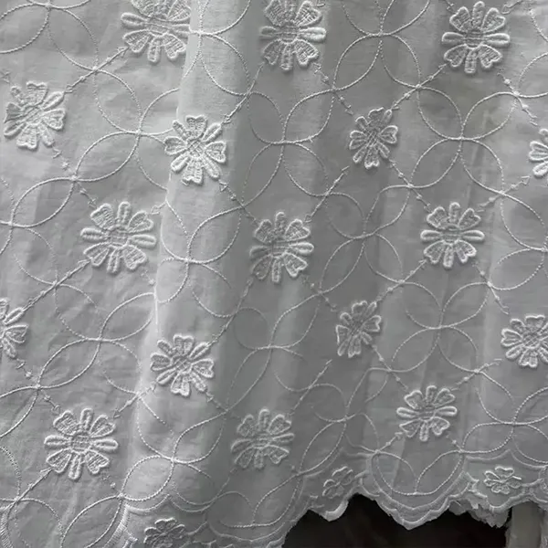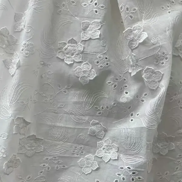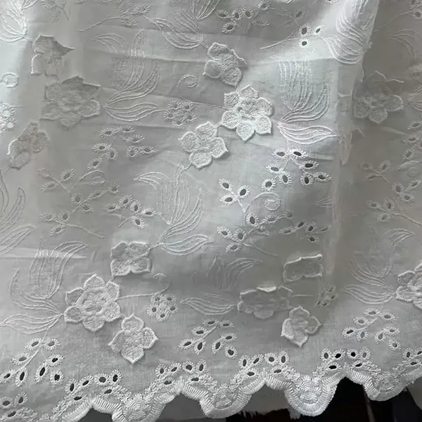 3Dフラワー装飾された100%の綿刺繍レース生地は、3D花の刺繍と繊細なアイレットカットワークを備えたアイレット穴を備えた、ブライダルウェア、ドレス、ブラウスに通気性の優雅さを提供します。寸法デザインは、柔らかさとドレープを維持しながら、豪華なテクスチャーを作成します。ロマンチックでヴィンテージ風のファッションに最適です。