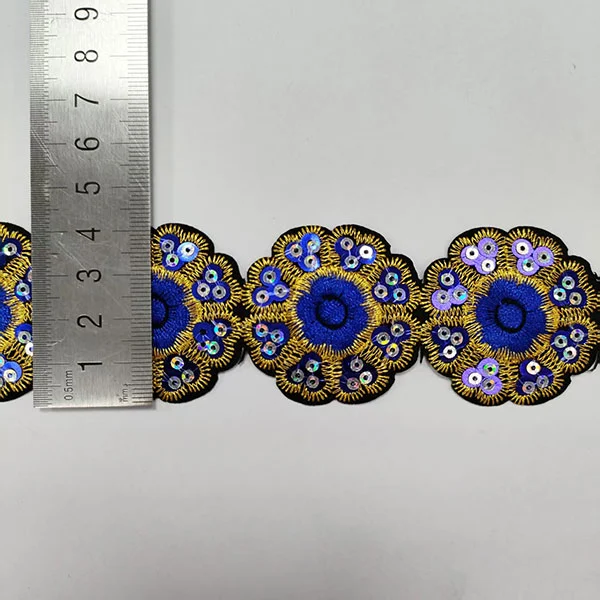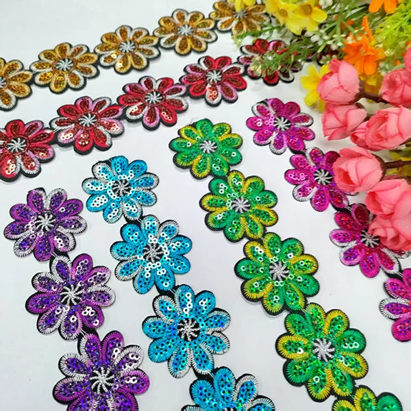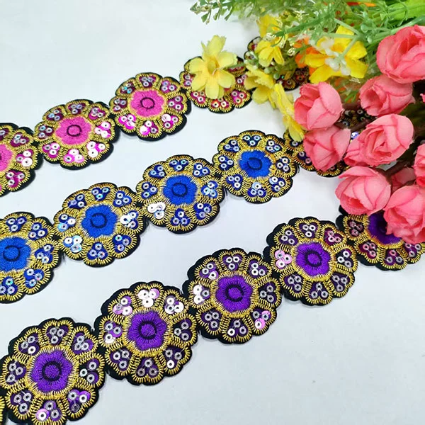 スパンコールの衣料品アクセサリーバック接着剤でトリミング、特に粘着性のバッキングを備えたレーストリムは、さまざまなプロジェクトに輝きと魅力を加える人気のある多用途の方法を表しています。これには、スパンコールとして知られる小さな光沢のあるディスクで飾られた装飾的なレースが含まれます。