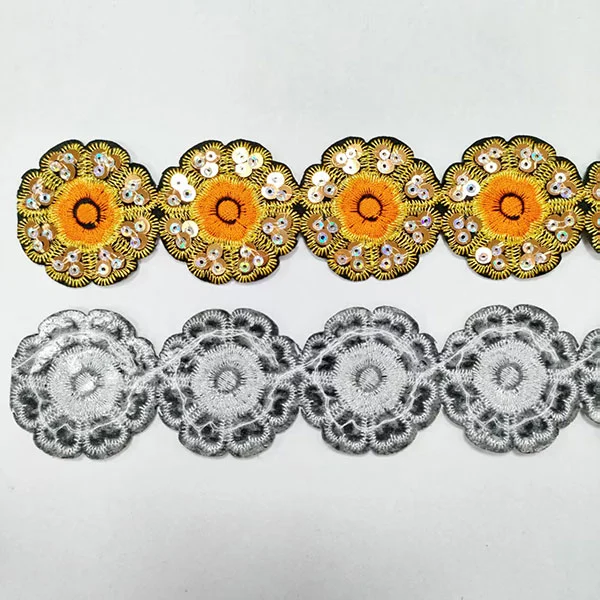 このタイプのレーストリミングは、ドレス、トップス、スカート、ジャケットなどの衣料品を装飾するためのファッションデザインで一般的に使用されています。また、バッグ、靴、帽子、さらには家の装飾プロジェクトなどのアイテムのアクセサリーに使用することもできます。バック接着剤でトリミングするスパンコールの衣料品アクセサリーは、装飾を追加し、作品の外観を高めるための迅速で便利な方法を提供します。